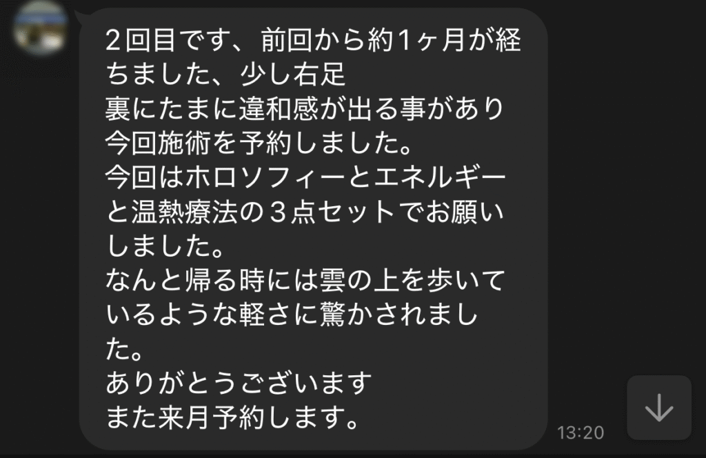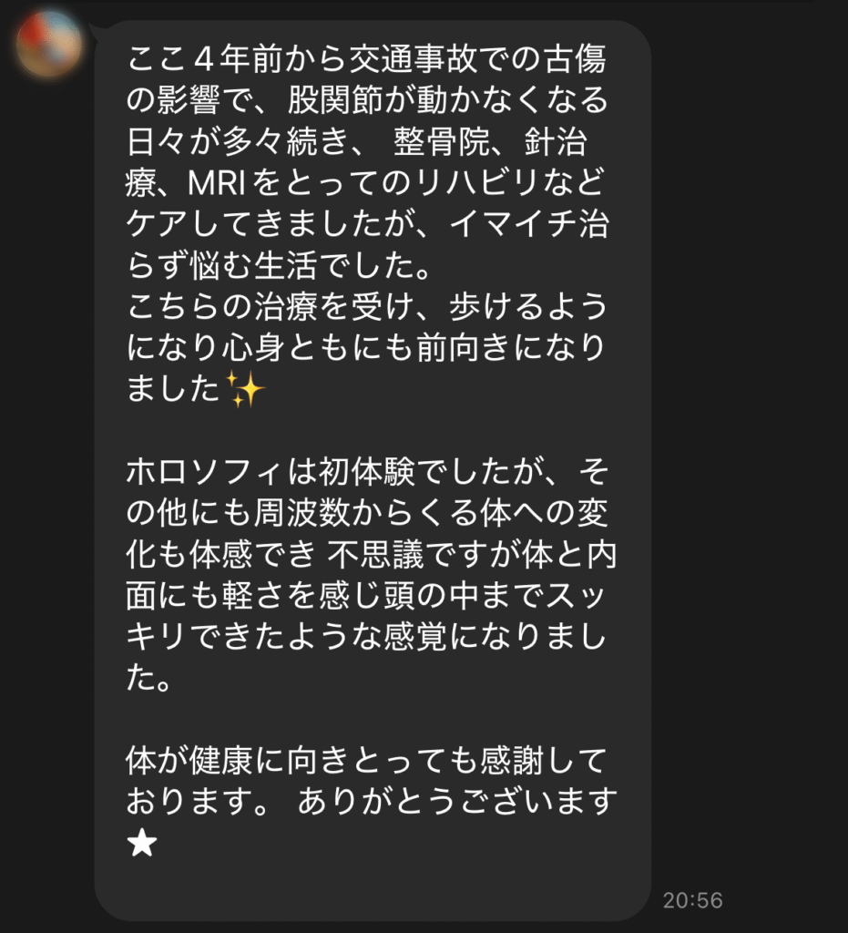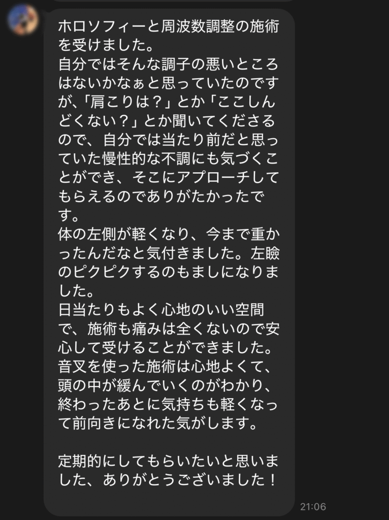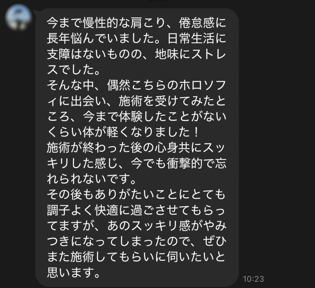 そんな中、偶然こちらのホロソフィに出会い、施術を受けてみたところ、今まで体験したことがないくらい体が軽くなりました!
