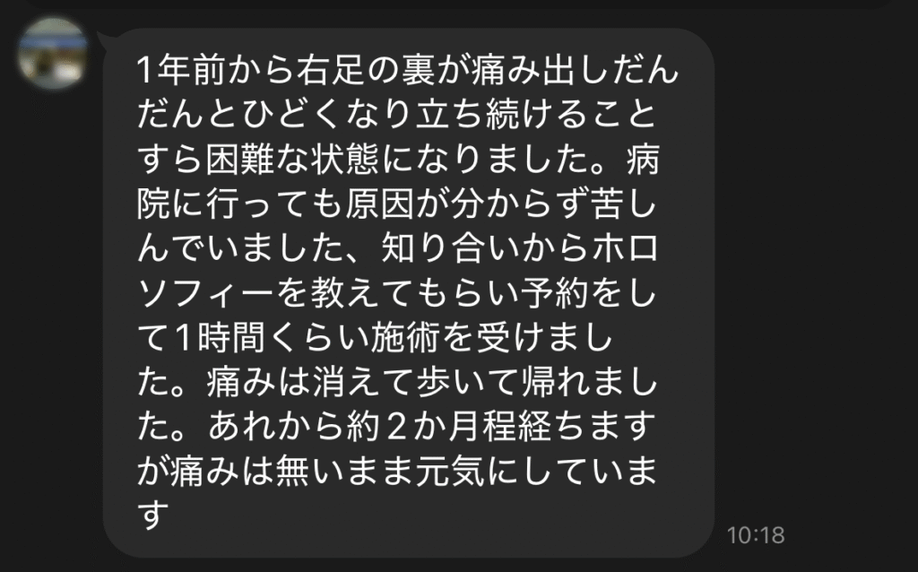 病院に行っても原因が分からず苦しんでいました、知り合いからホロソフィーを教えてもらい予約をして1時間くらい施術を受けました。