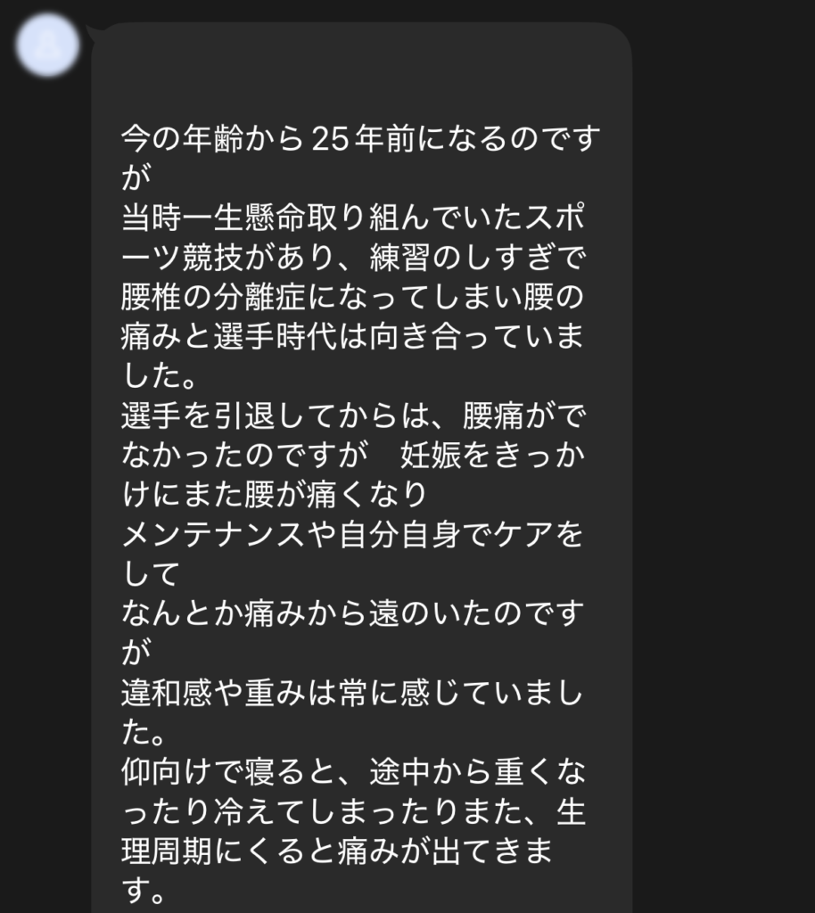 当時一生懸命取り組んでいたスポーツ競技があり、練習のしすぎで腰椎の分離症になってしまい腰の痛みと選手時代は向き合っていました。
