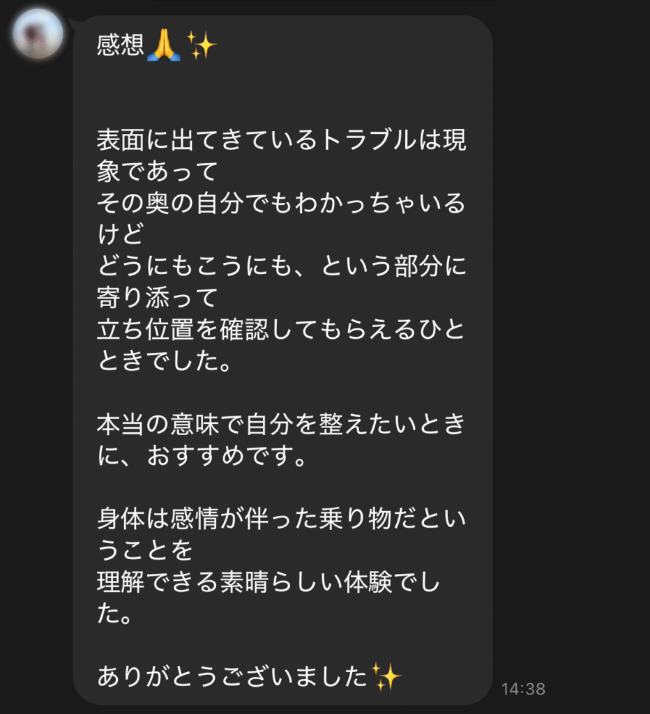 表面に出てきているトラブルは現象であってその奥の自分でもわかっちゃいるけど どうにもこうにも、という部分に寄り添って立ち位置を確認してもらえるひとときでした。 本当の意味で自分を整えたいときに、おすすめです。 身体は感情が伴った乗り物だということを 理解できる素晴らしい体験でした。 ありがとうございました✨