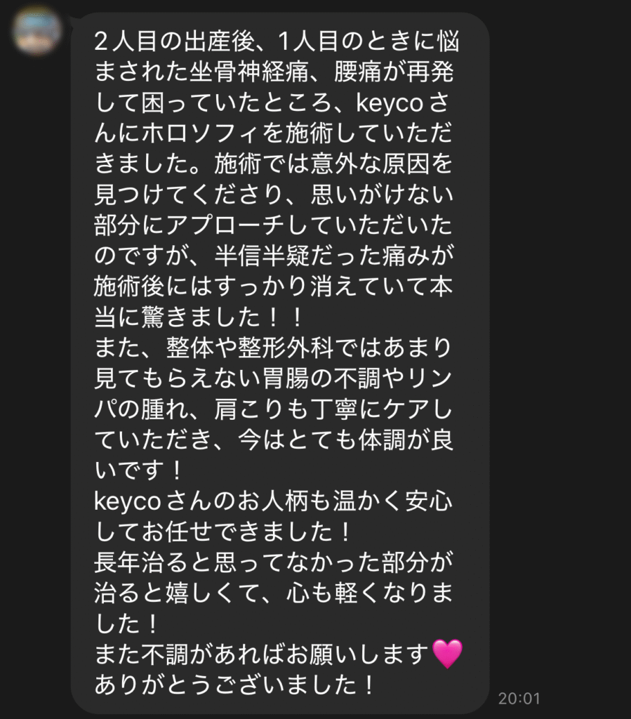 2人目の出産後、1人目のときに悩まされた坐骨神経痛、腰痛が再発して困っていたところ、keycoさんにホロソフィを施術していただきました。施術では意外な原因を見つけてくださり、思いがけない部分にアプローチしていただいたのですが、半信半疑だった痛みが施術後にはすっかり消えていて本当に驚きました!!